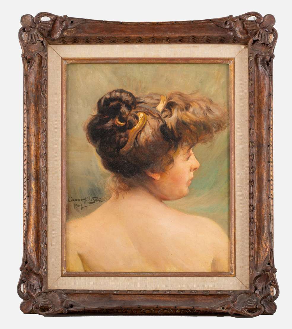 Óleo s/ madeira, ass. inf. dir. e ass. titulado dat. 7/4/39 no verso. 32 x 26cm