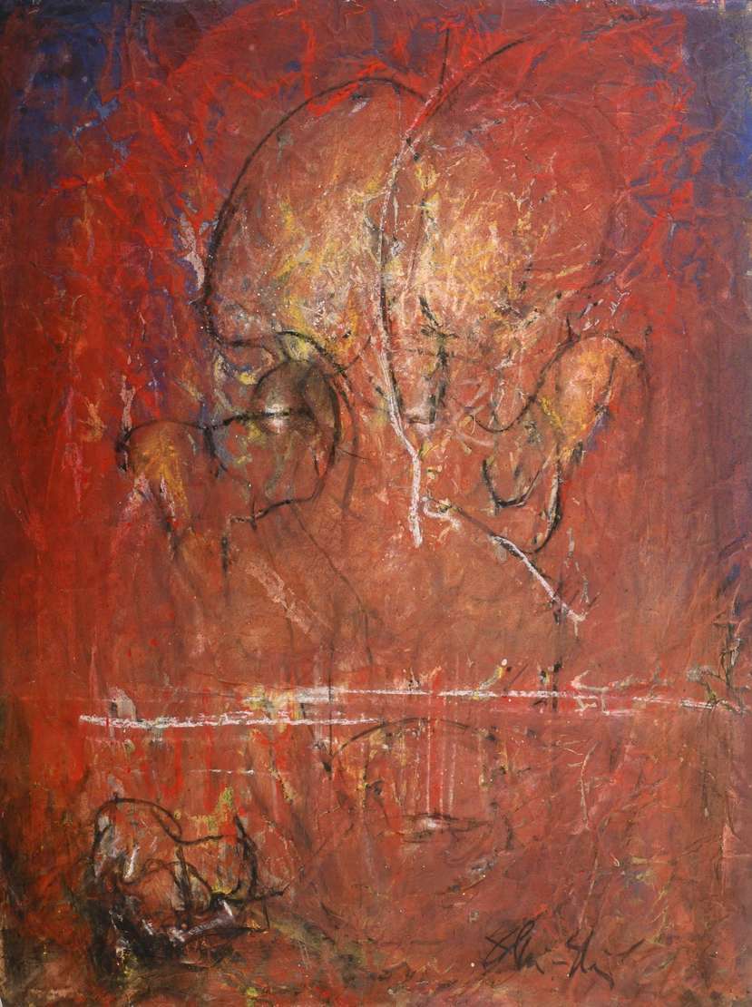 Acrílica e guache s/ cartão colado em chapa de madeira, ass. dat. 1987 sup. dir.