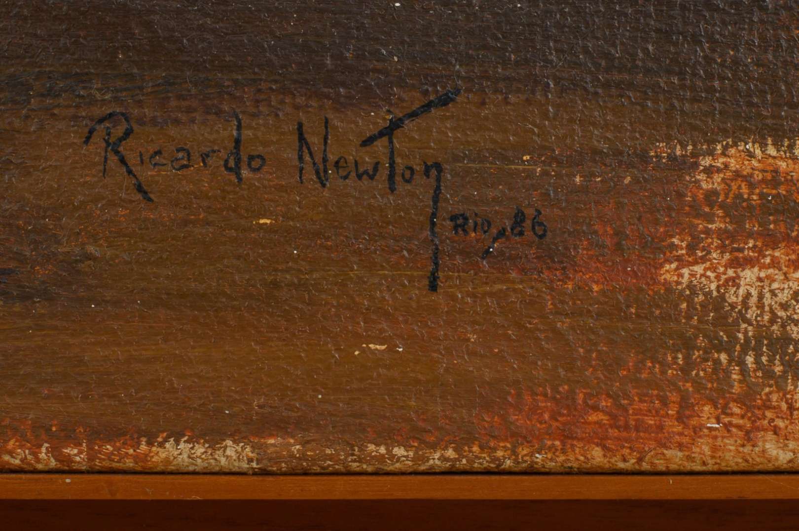 Óleo s/ chapa madeira ind., ass. sup. esq.