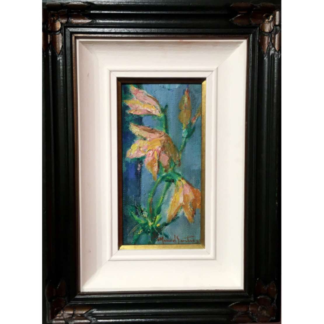 Flores. Óleo s/ chapa madeira, ass. inf. dir. e no verso (década 1970). 26,5 x 12,5 cm