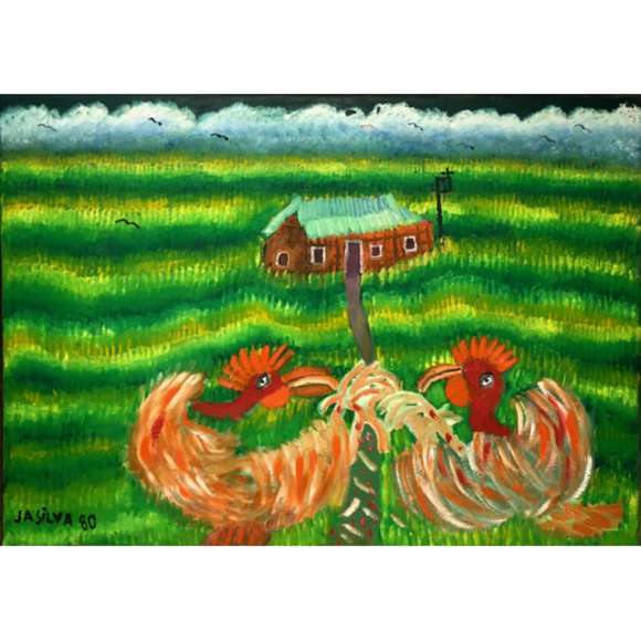Briga de Galos. Óleo s/ tela, ass. dat. 80 inf. esq. e ass. dat. e com etiqueta da Galeria Renot no verso. 50 x 71 cm...