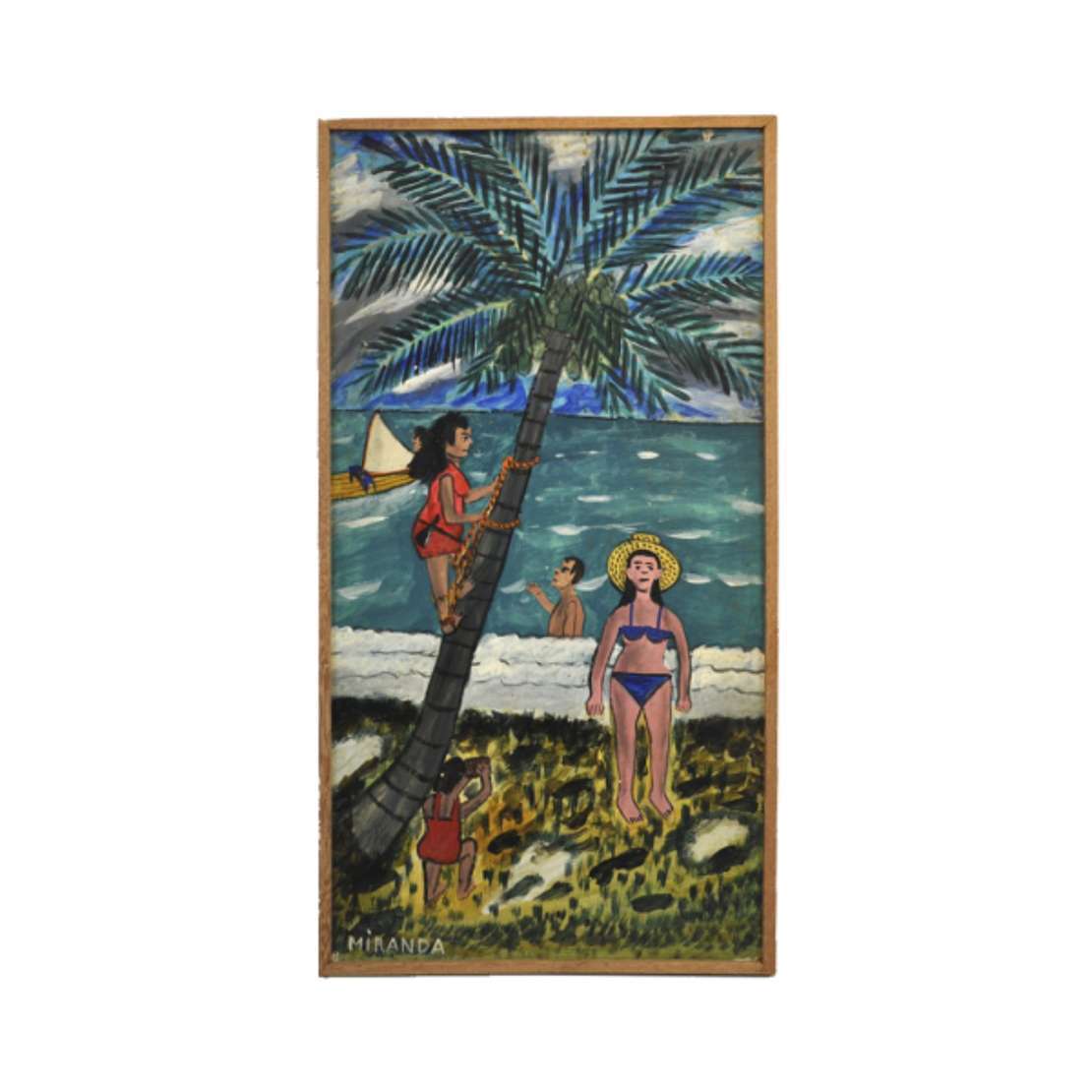 Colhendo Coco. Óleo s/ chapa de madeira, ass. inf. dir. 61 x 31cm. Com etiqueta do MIAN - Museu Internacional de Arte Naif do Brasil, sob o nº 2645 no verso.