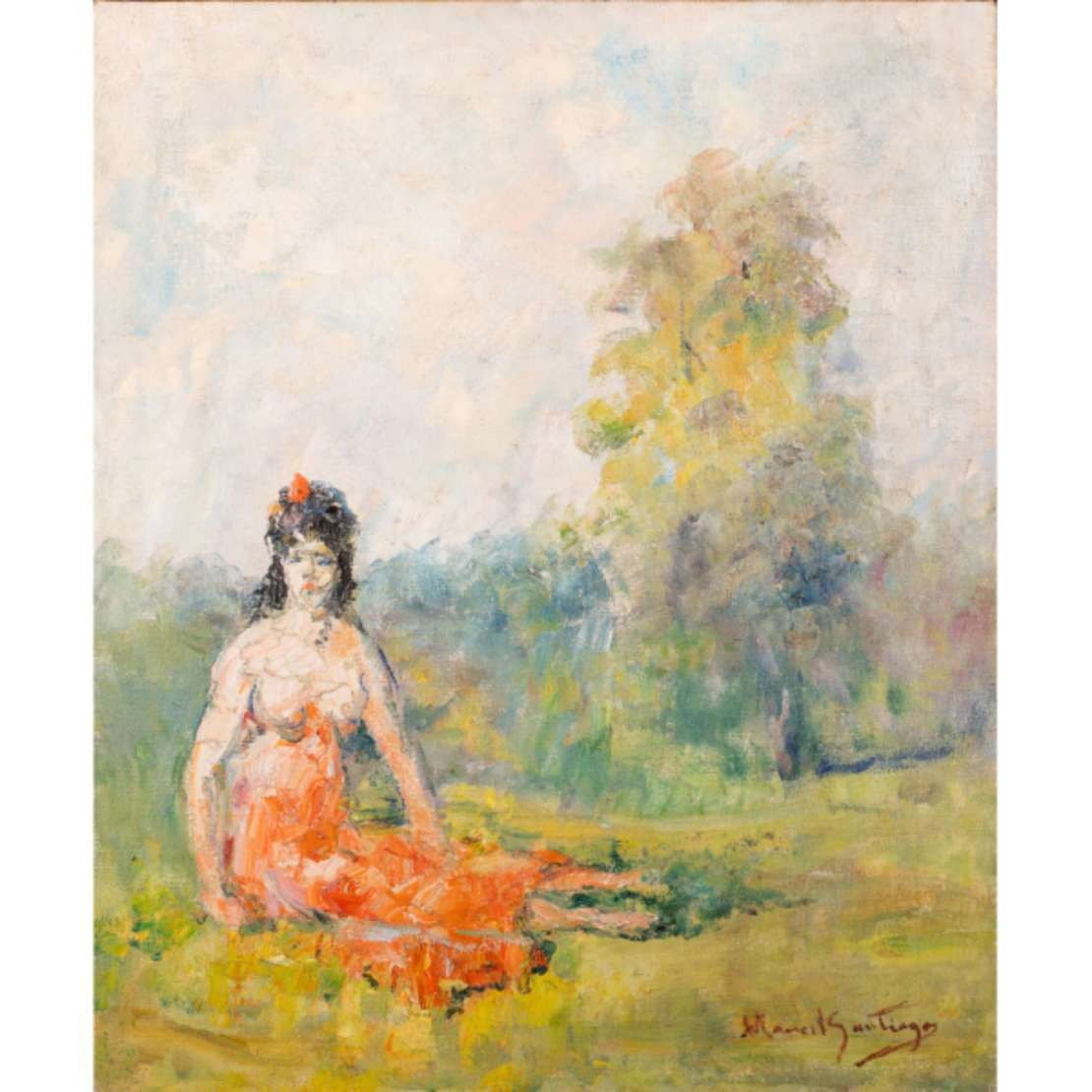 Guignard, Alberto da Veiga. Pintura a óleo s/ almofada de janela, sem assinatura. (Década 1950). 100 x 36cm. Procedên...